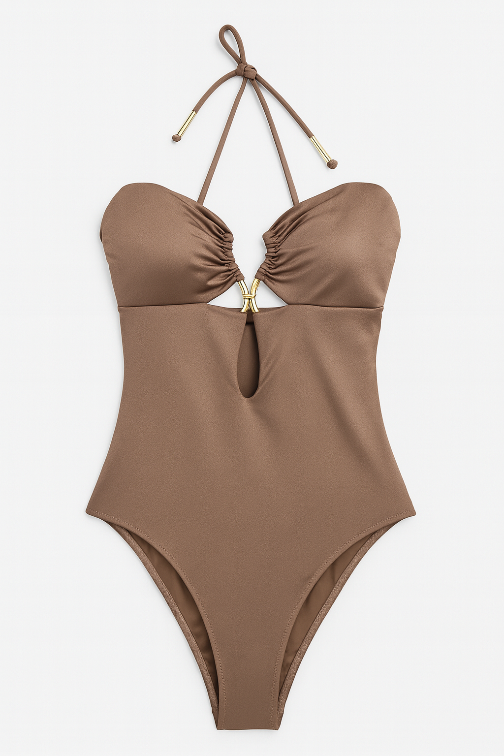 Şıklığı ve konforu bir araya getiren bronz kadın mayo , altın detaylı halkasıyla modern ve zarif bir görünüm sunar. Esnek kumaşı sayesinde gün boyu rahat kullanım sağlar.